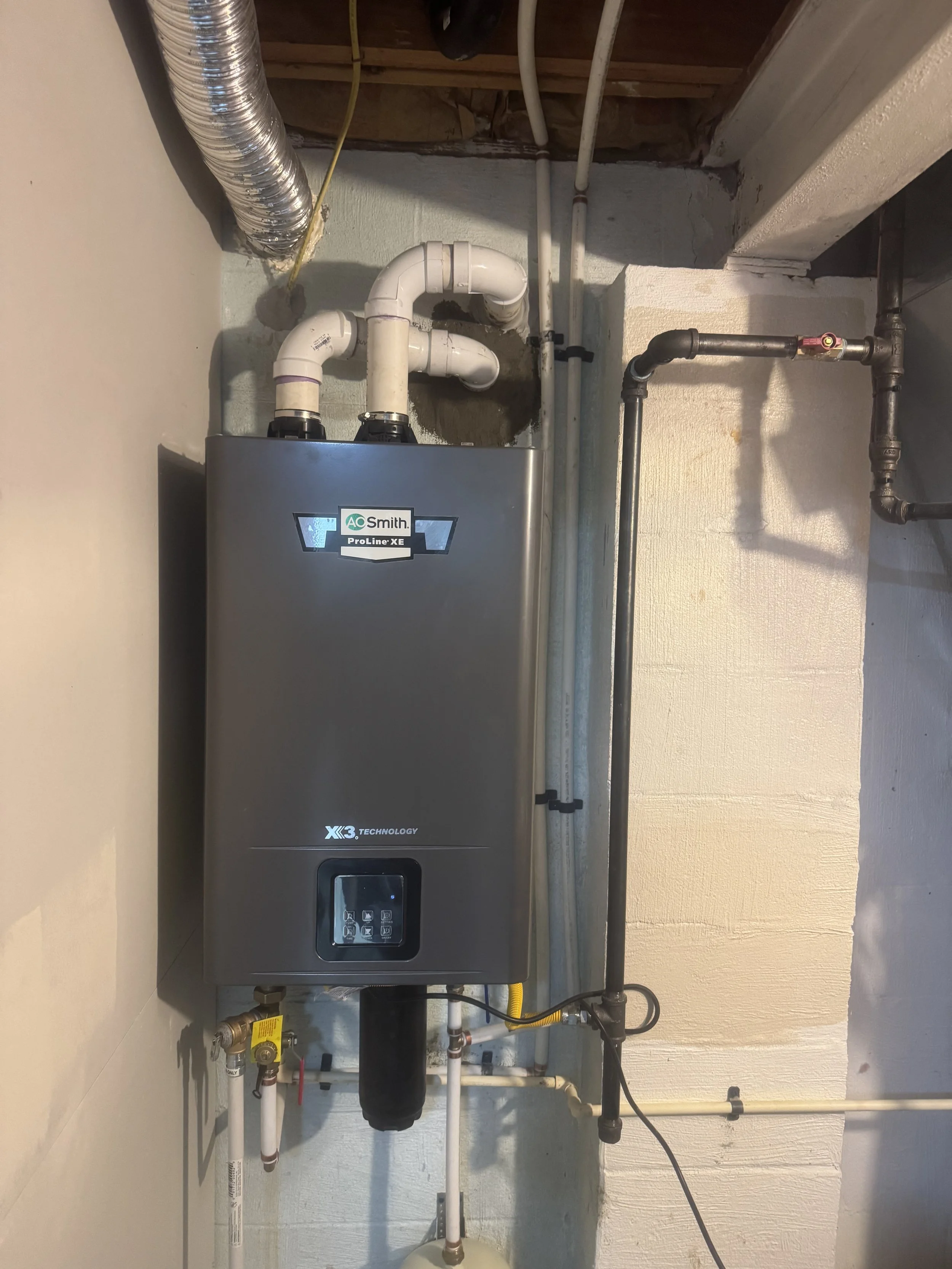 When our team came out to this Upper St. Clair home, the existing gas supply line to the water heater location was too small for the new A.O. Smith ProLine XE tankless unit being installed. We ran new, clean square-cut black iron pipe from the main supply to the unit — you can see it in the photo above. Everything is cut clean, threaded tight, and properly supported. We also installed a new quarter-turn ball valve shutoff right at the unit, giving the homeowner a dedicated, easy-to-reach shutoff that meets current code requirements.